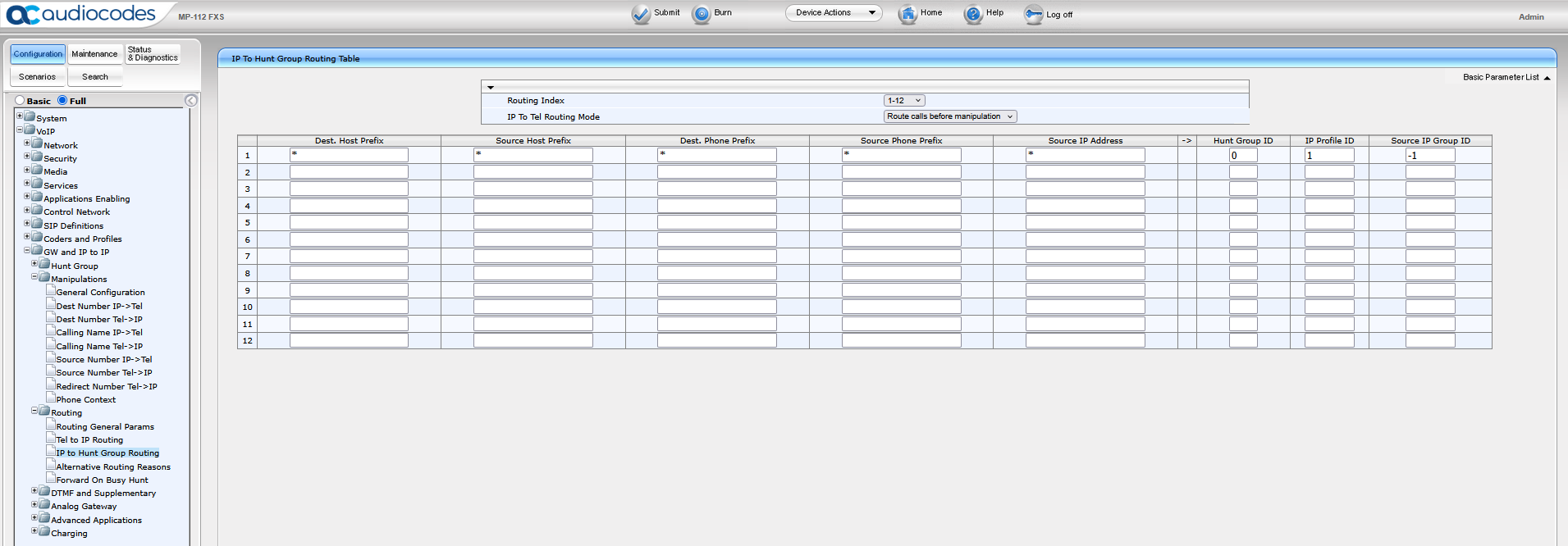 Geben Sie im Menü Routing > Tel to IP Routing die folgenden Informationen ein:
