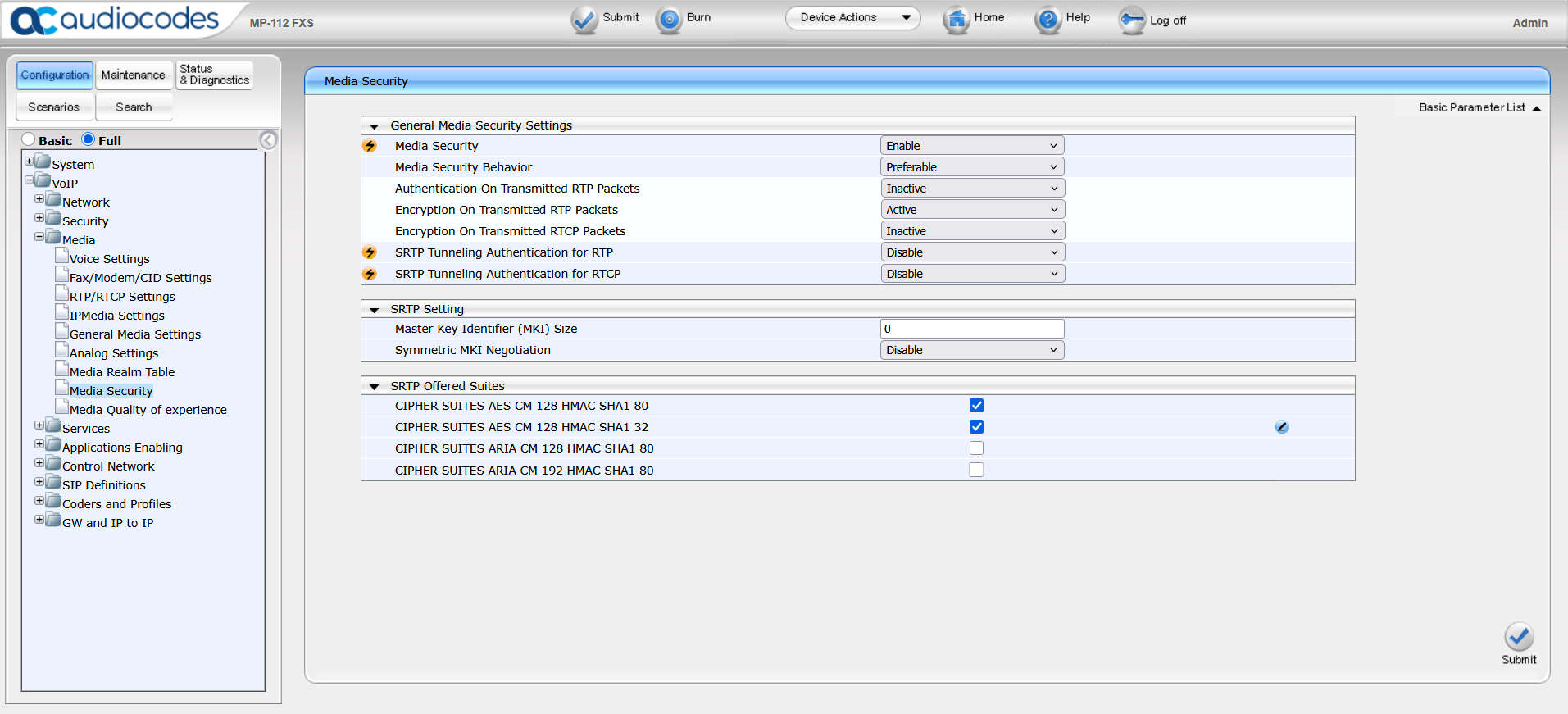 Puis mettre la valeur media security à enable et media security behavior à preferable