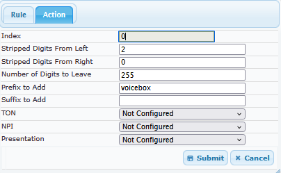 Pour permettre au téléphone analogique d'appeler la messagerie vocale, il faut configurer un préfixe et transformer la partie utilisateur du header SIP To en "voicebox". Pour ce faire, rendez vous dans le menu GW and IP to IP > Manipulations > Dest Number Tel -> IP puis éditez la règle comme décrit ci dessous :