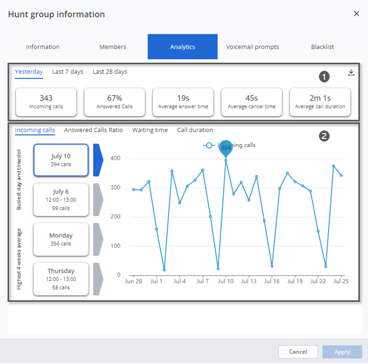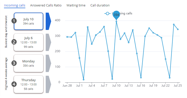 - Las barras verdes representan el número medio de llamadas entrantes. En este ejemplo, el grupo recibió 356 llamadas de media en los últimos 4 lunes, que es el día de la semana con más actividad en los últimos 28 días.