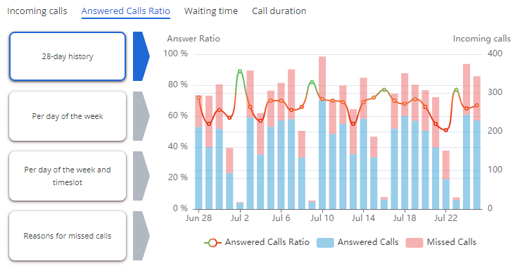 El gráfico del historial de 28 días es una vista por día de las llamadas contestadas, las llamadas perdidas y la proporción de llamadas contestadas mostradas con un gradiente de color que va del verde (más del 80% de llamadas contestadas) al rojo (menos del 60%).
