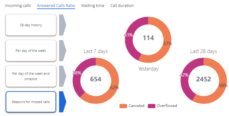El gráfico Motivos de las llamadas perdidas muestra la distribución de llamadas perdidas del día anterior, de los últimos 7 días y de los últimos 28 días.