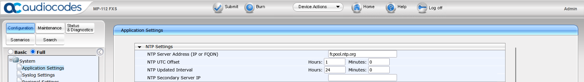 NTP debe configurarse antes de poder importar certificados en el dispositivo. Para ello, vaya al menu Sistema > Configuración de la aplicación y edite los siguientes valores: