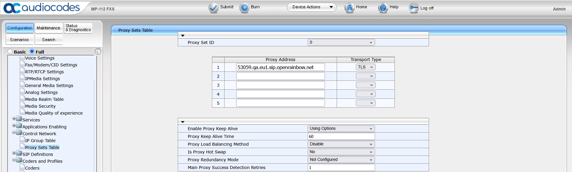 En la pestaña Dirección del proxy, introduzca la dirección IP de la plataforma Rainbow, y en la pestaña Tipo de transporte, introduzca TLS.