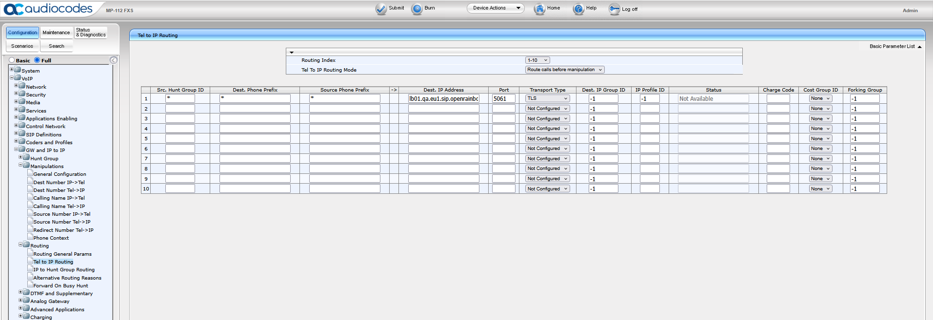 En el menu Enrutamiento > Enrutamiento Tel a IP, introduzca la siguiente información: