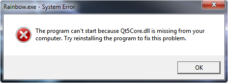 You have installed the Rainbow Desktop App and get following missing Qt5Core.dll error message when starting the app