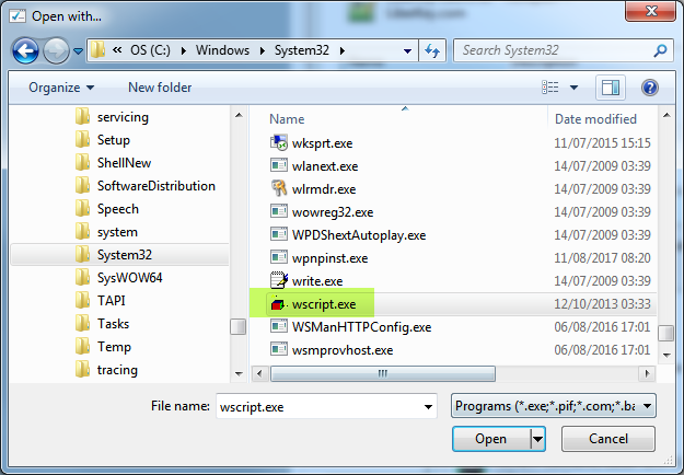 - If Microsoft ® Windows Based Script Host is not in the list you have to browse to C:\Windows\System32\ to find the program wscript.exe and select it.