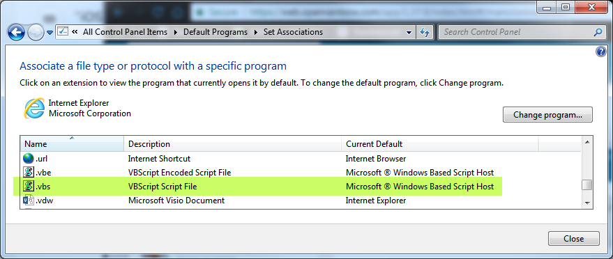 - trouvez l'entrée .vbs et cliquez sur Changer de programme, puis sélectionnez Microsoft ® Windows Based Script Host.