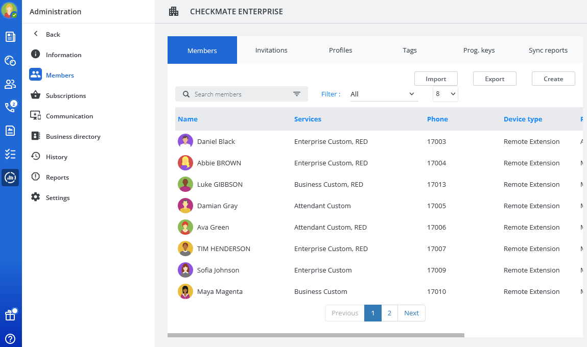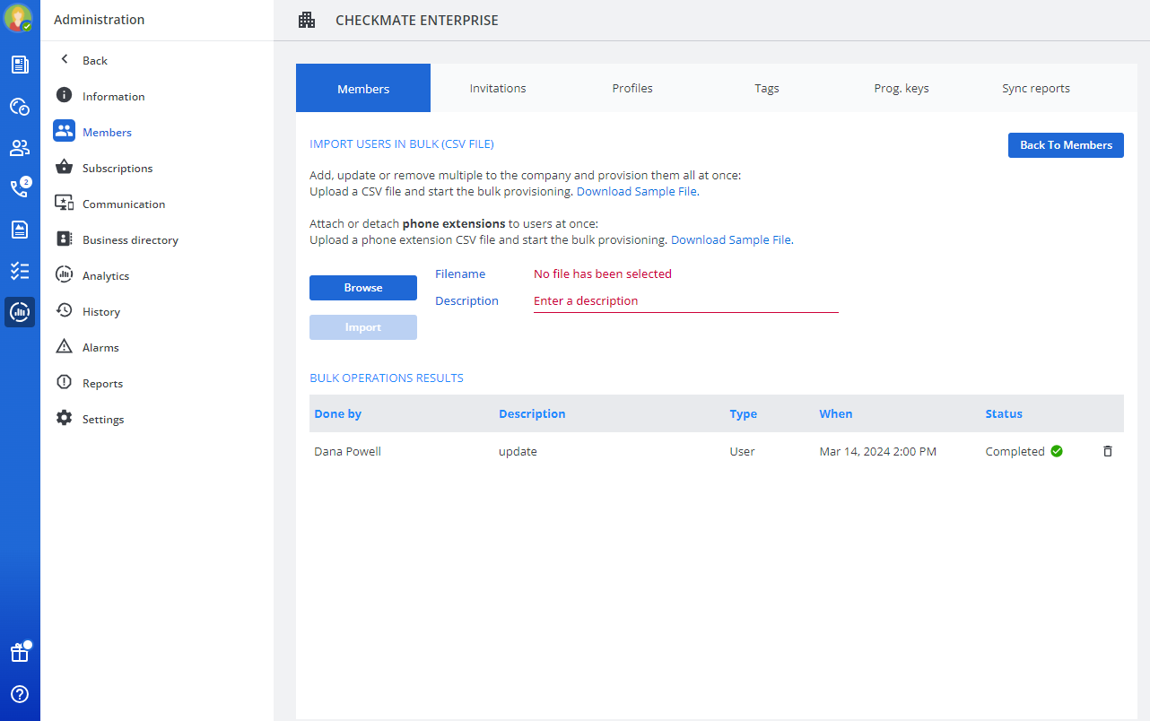 - Per creare nuovi membri dell'azienda e/o associare i dati del PBX, clicchi su Importazione, icona CSV e Scarica file di esempio.