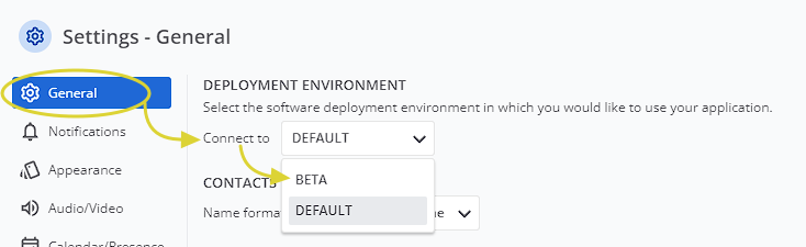 Importante: se torna alla versione di produzione rimettendo l'impostazione su DEFAULT, solo la versione del client web incorporata nell'applicazione Desktop passerà alla versione di produzione. Se desidera riportare l'applicazione Desktop alla versione di produzione, deve disinstallare la versione beta e installare la versione ufficiale di produzione.