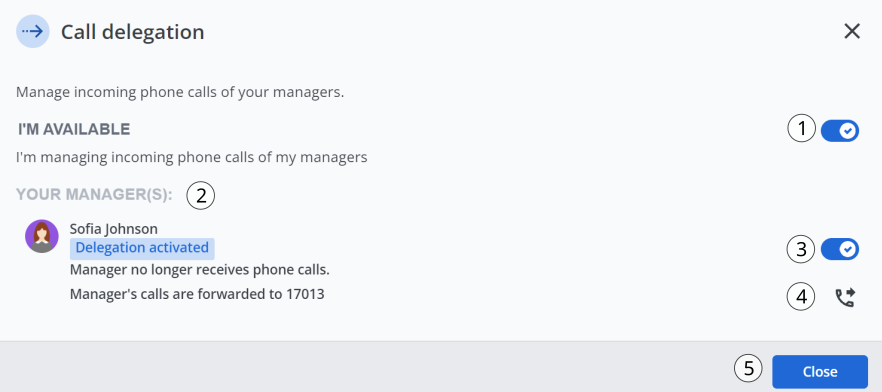 Apra la finestra Delega di chiamata per vedere lo stato di delega di chiamata del suo manager: "Disponibile" o "Non disponibile". Definisca la sua disponibilità. Mostra lo stato di inoltro del suo manager (