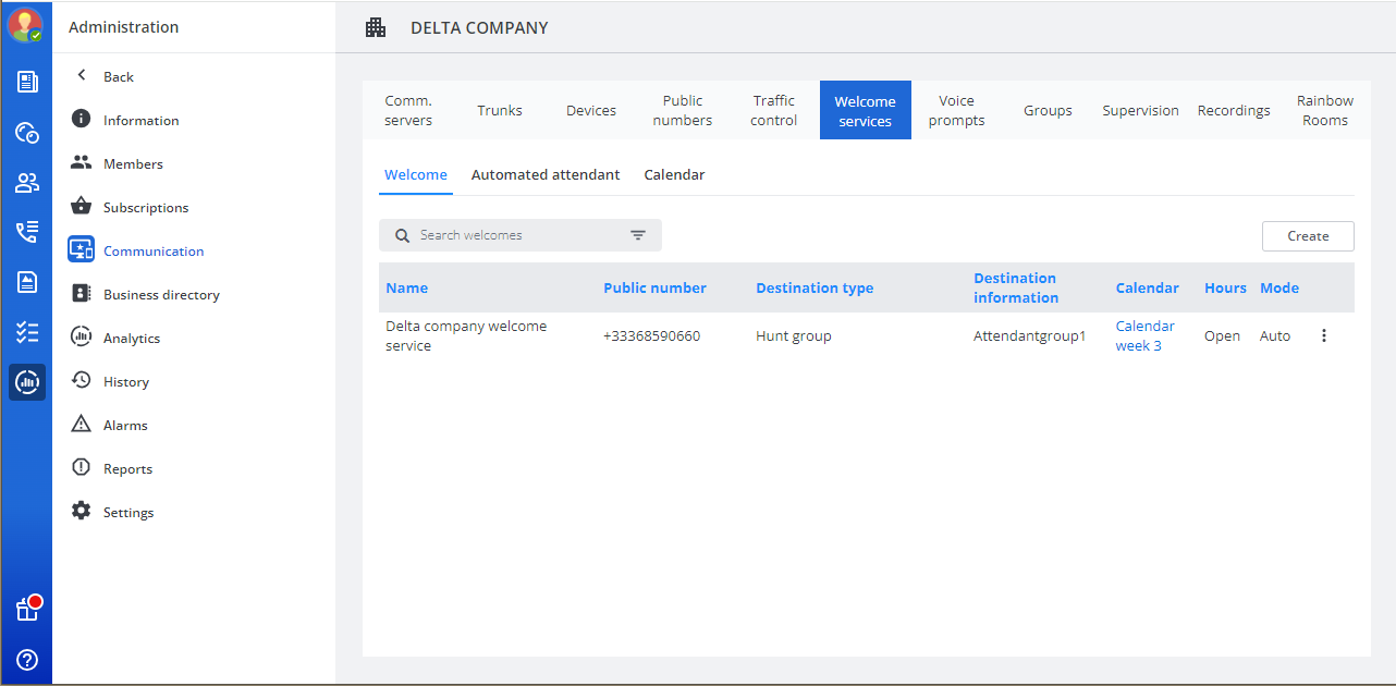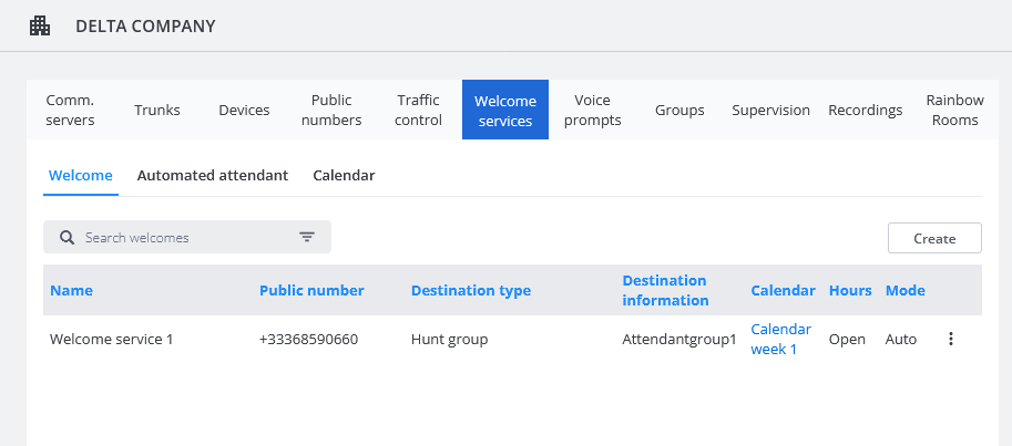 Per un'azienda è possibile configurare uno o più servizi di benvenuto. Ogni servizio di benvenuto è associato a un numero pubblico e ha un proprio calendario di orari di apertura, con la possibilità di: