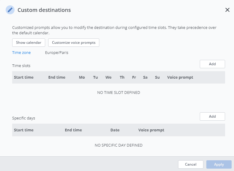 - Un calendario specifico in cui i periodi dell'orario di chiusura (fasce orarie e/o giorni specifici) hanno una propria destinazione. Le destinazioni possono essere solo dei messaggi vocali personalizzati: veda: Configurazione di un calendario specifico per gli orari di chiusura.
