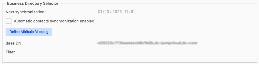 Filtro: facoltativamente, applichi un filtro per sincronizzare solo un sottoinsieme di contatti della directory LDAP (utilizzi la sintassi LDAP per la definizione del filtro). Per impostazione predefinita, vengono sincronizzati tutti i contatti nella directory LDAP(oggetti contatto) .