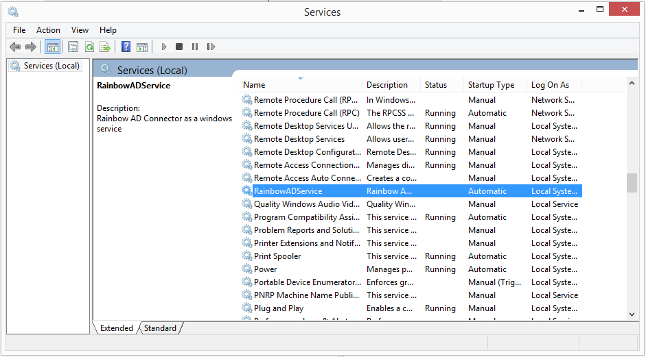 Il servizio RainbowADService deve apparire nell'elenco dei servizi e deve essere avviato se è stato selezionato durante l'installazione.