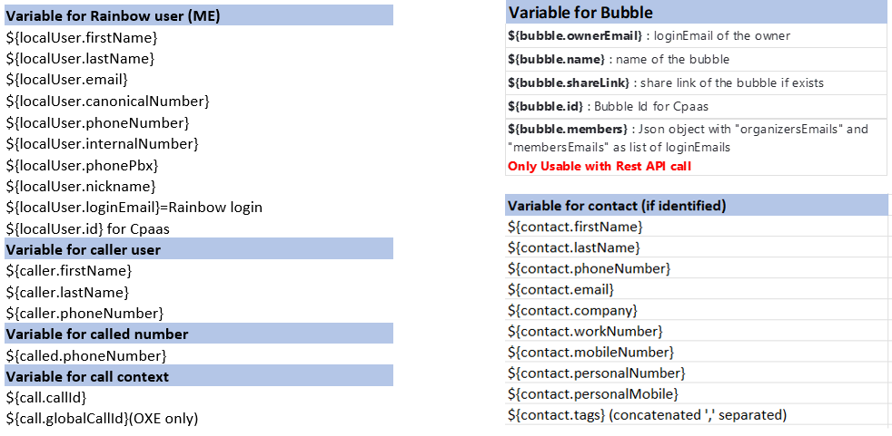 Questo articolo consente di aggiungere funzionalità personalizzate alle applicazioni Rainbow dei membri dell'azienda, utilizzando una serie di azioni configurabili da un file custo-manifest.json. Le funzioni personalizzate sono disponibili per le aziende associate a Cloud PBX o Alcatel-Lucent Enterprise PBX (OmniPCX Enterprise o OXO Connect).