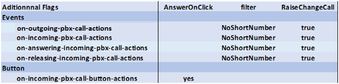 - "AnswerOnClick": se impostato su true, esegue l'azione e risponde alla chiamata in arrivo contemporaneamente (solo per l'azione on-incoming-pbx-call-button-actions )