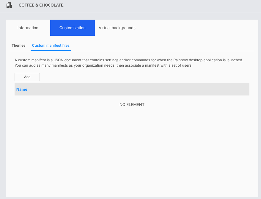 Quando si distribuisce dall'applicazione Rainbow di amministrazione, il file custo-manifest.json non può più essere configurato localmente dall'applicazione Rainbow dei membri dell'azienda: le opzioni di esportazione/importazione non sono più offerte.