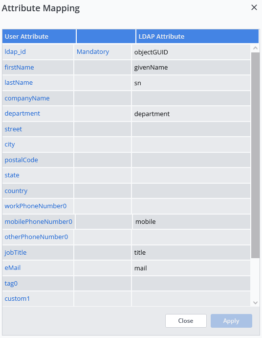 La tabella di mappatura predefinita è: - Per ogni attributo Rainbow da mappare, inserisca l'attributo corrispondente della directory LDAP nella colonna Attributo LDAP.
