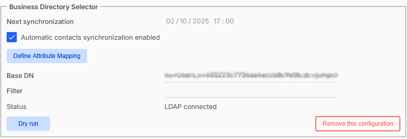 L'opzione Rimuovi questa configurazione elimina la sincronizzazione degli utenti in questa directory/dominio LDAP, ma conserva la sincronizzazione della directory, se esiste.