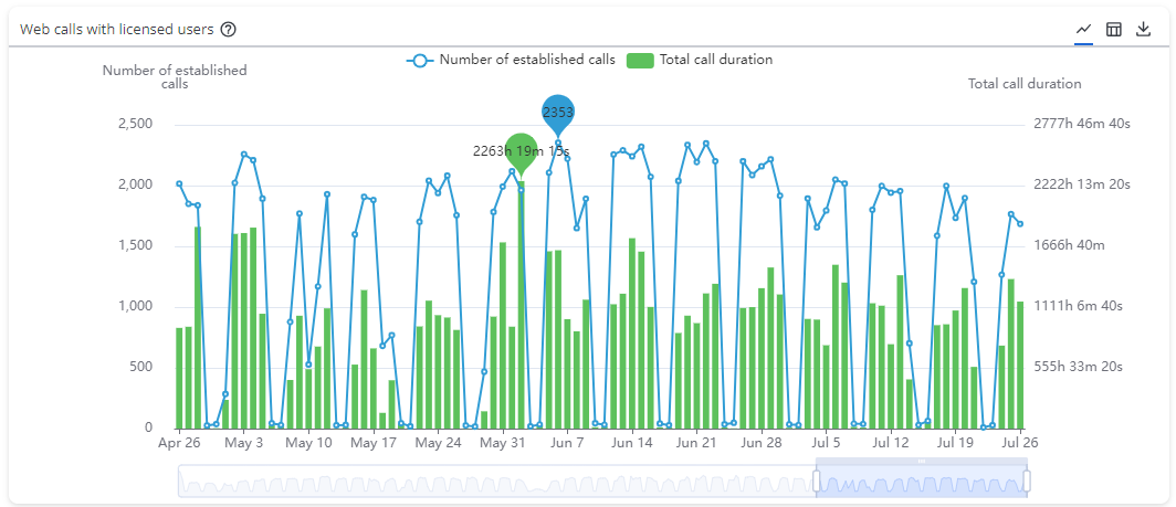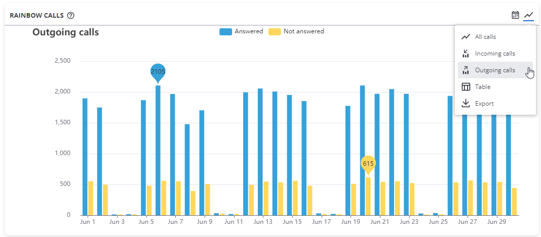 La sezione Comunicazione peer-to-peer nelle analisi copre gli scambi effettuati su Rainbow tra due utenti, sia con messaggi che con chiamate Rainbow.