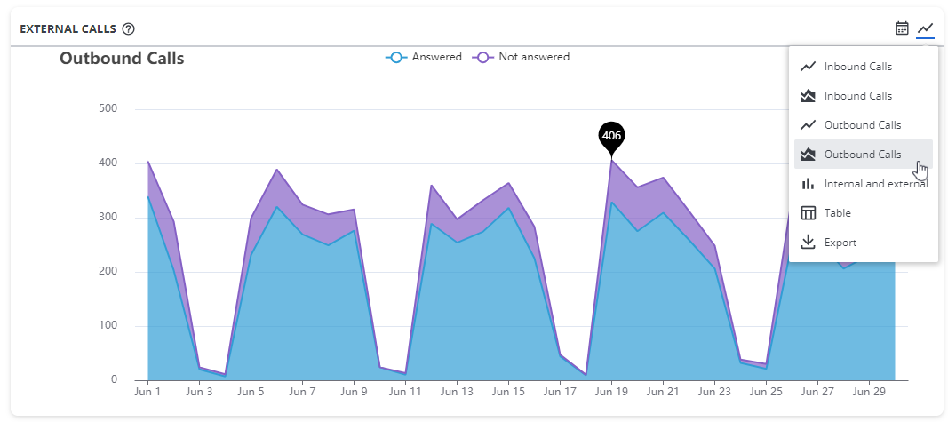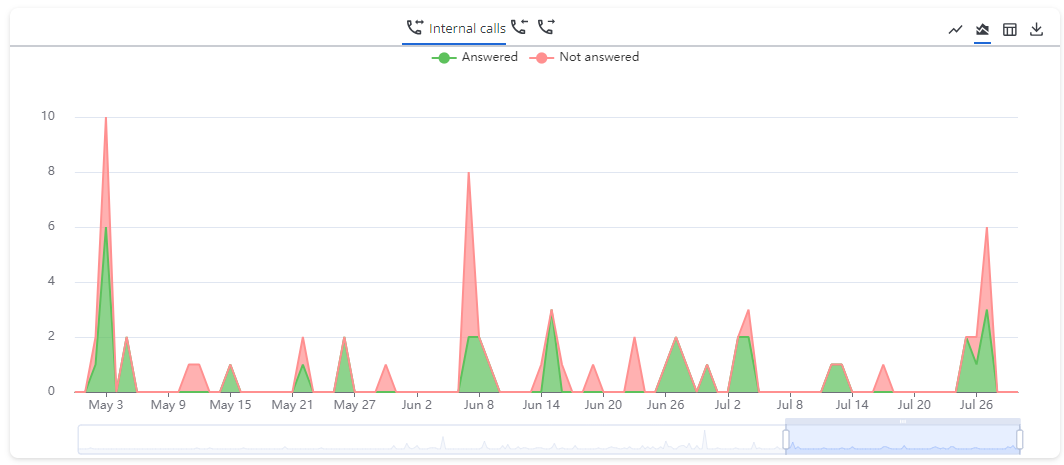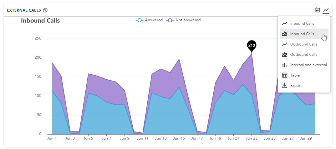 Questo grafico è l'equivalente di 1 anno della modalità telefonia del cruscotto globale. È disponibile come grafico a linee o come grafico ad area impilato: