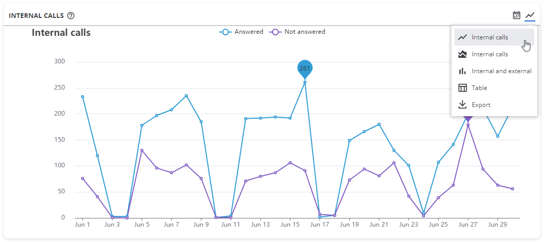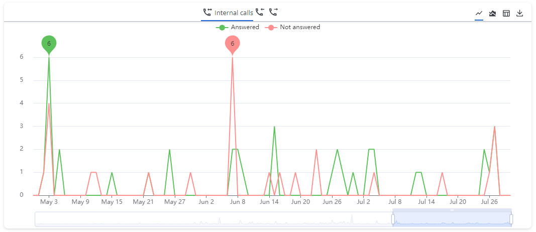 Questa metrica mantieni traccia delle chiamate telefoniche tra utenti dell'azienda in cui almeno uno degli interlocutori ha un account Rainbow. Se entrambi gli interlocutori hanno un account Rainbow, la chiamata viene conteggiata una sola volta. Viene conteggiata qualsiasi modalità di telefonia.
