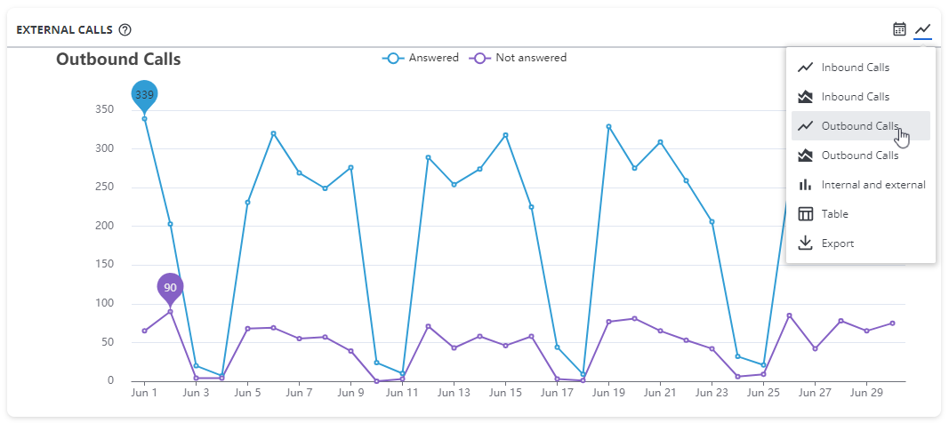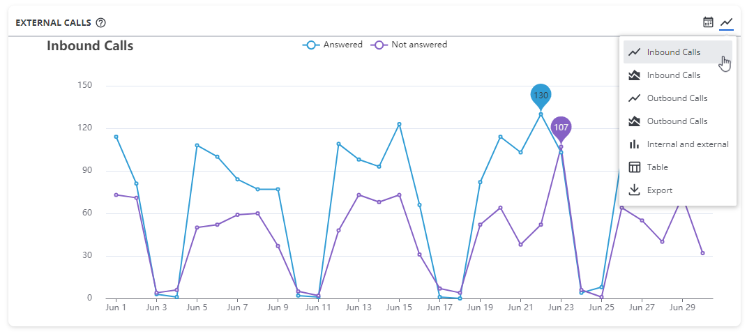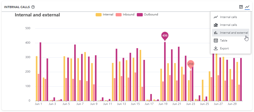 Questo grafico è l'equivalente a 1 anno del grafico delle chiamate interne e delle chiamate esterne nel cruscotto globale: