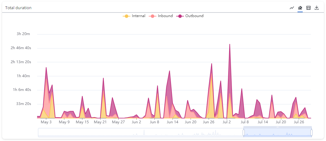 Questo grafico rappresenta la durata totale di tutte le chiamate telefoniche al giorno. È disponibile come grafico a linee o come grafico ad area sovrapposto: