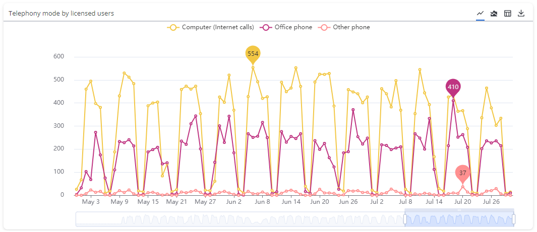 Questa metrica rappresenta il numero di utilizzi (non di chiamate) delle diverse modalità di telefonia nel periodo selezionato. Gli utilizzi possono essere: