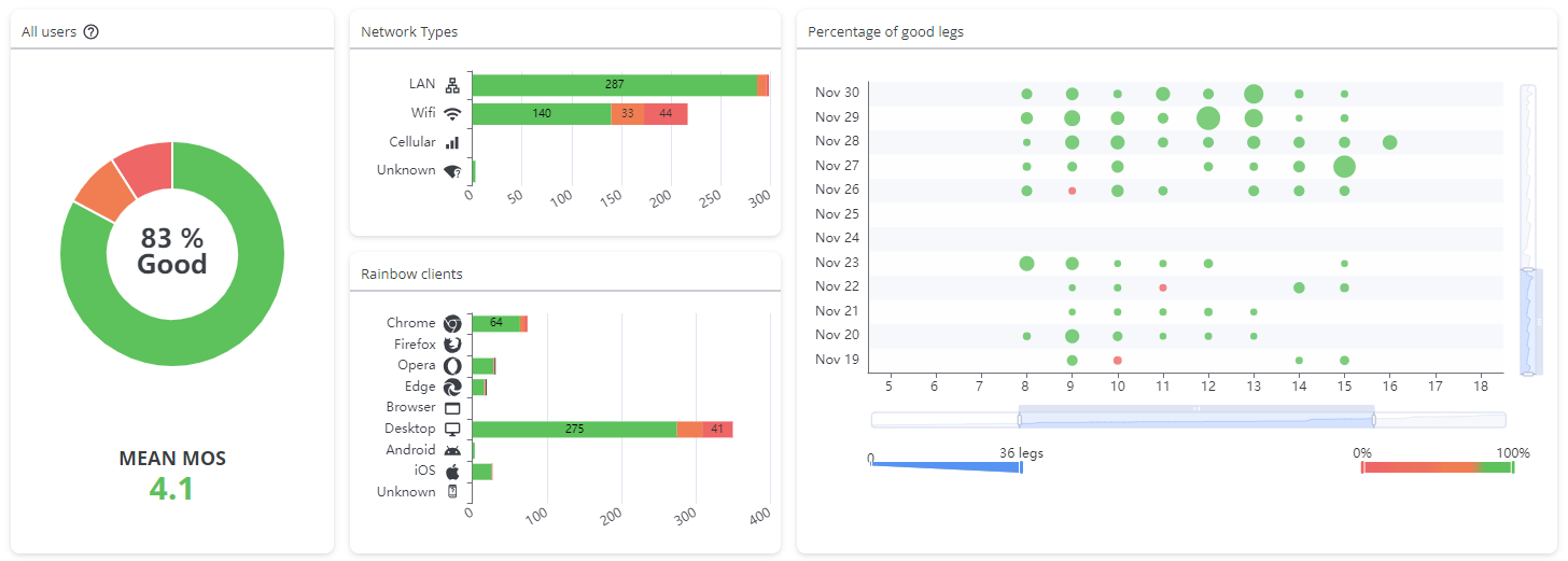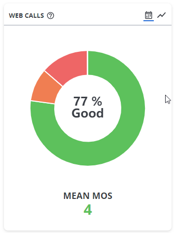 - Un grafico a torta che rappresenta la distribuzione delle tratte di chiamata raggruppate per qualità audio: buona, media, cattiva e senza audio. In basso è indicato il MOS medio di tutte le tratte.