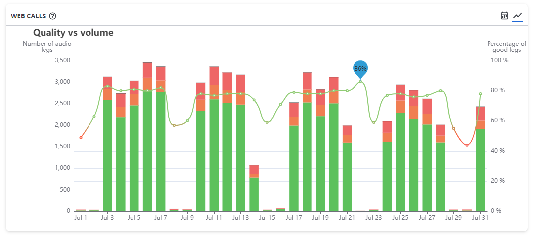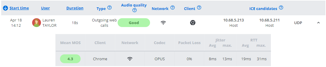 Questi grafici possono essere utili per identificare problemi di qualità globale; ad esempio, le chiamate effettuate su Wi-Fi hanno una qualità inferiore rispetto alle chiamate sulla LAN, indicando una possibile mancanza di prestazioni della rete Wi-Fi. - Ha accesso alle informazioni tecniche per tutte le gambe audio, che la aiutano ad approfondire i possibili problemi: