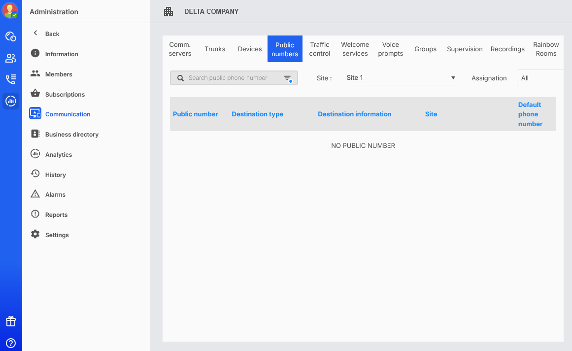Nella configurazione multi-sito, non è necessario che tutti i numeri pubblici e i membri dell'azienda siano associati ai siti. In questo caso, rimangono associati all'azienda.