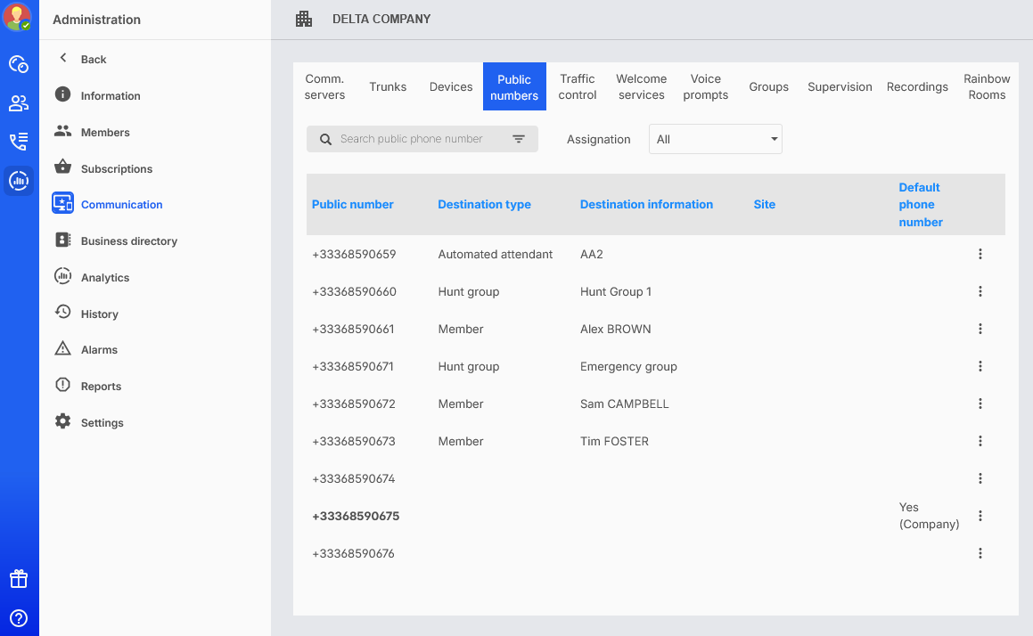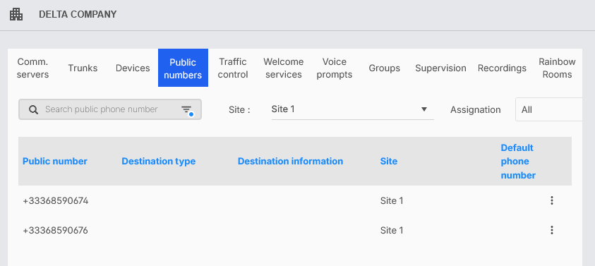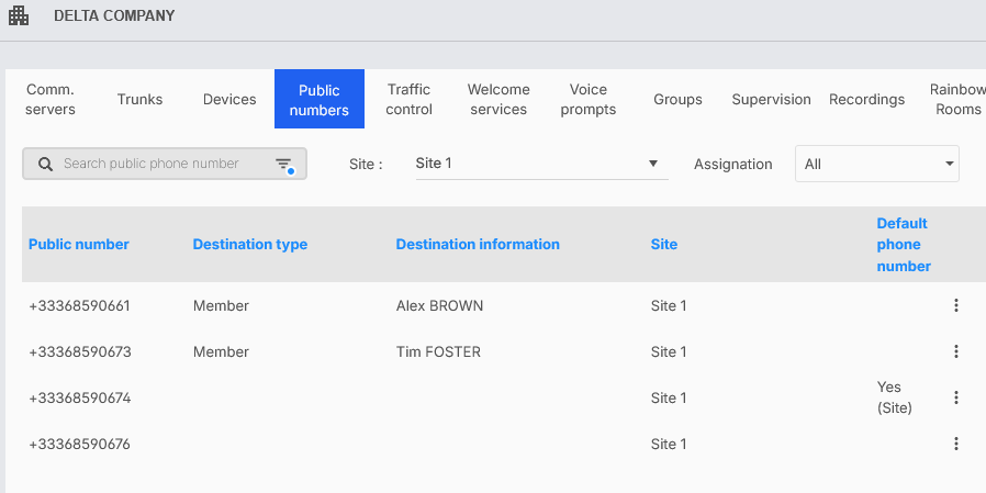Il numero pubblico selezionato viene impostato su Sì (Sito) nella colonna Numero di telefono predefinito.