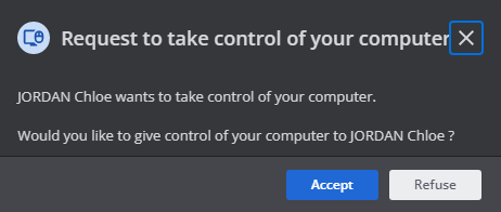 Richiedi il controllo del computer" oppure il suo contatto può darle il controllo del suo computer selezionando il menu"