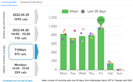 - De derde grafiek toont het gemiddelde aantal inkomende oproepen per weekdag. De individuele waarden van het aantal inkomende oproepen zijn ook gemarkeerd met 28 gekleurde stippen. Stippen van dezelfde kleur komen overeen met dagen van dezelfde week. Het bijbehorende tekstblok geeft aan welke weekdag gemiddeld de meeste inkomende oproepen heeft ontvangen.