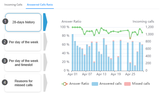 - De 28-daagse geschiedenisgrafiek is een weergave per dag van beantwoorde oproepen, gemiste oproepen en de verhouding van beantwoorde oproepen, weergegeven met een kleurverloop van groen (meer dan 80% beantwoorde oproepen) naar rood (minder dan 60%).