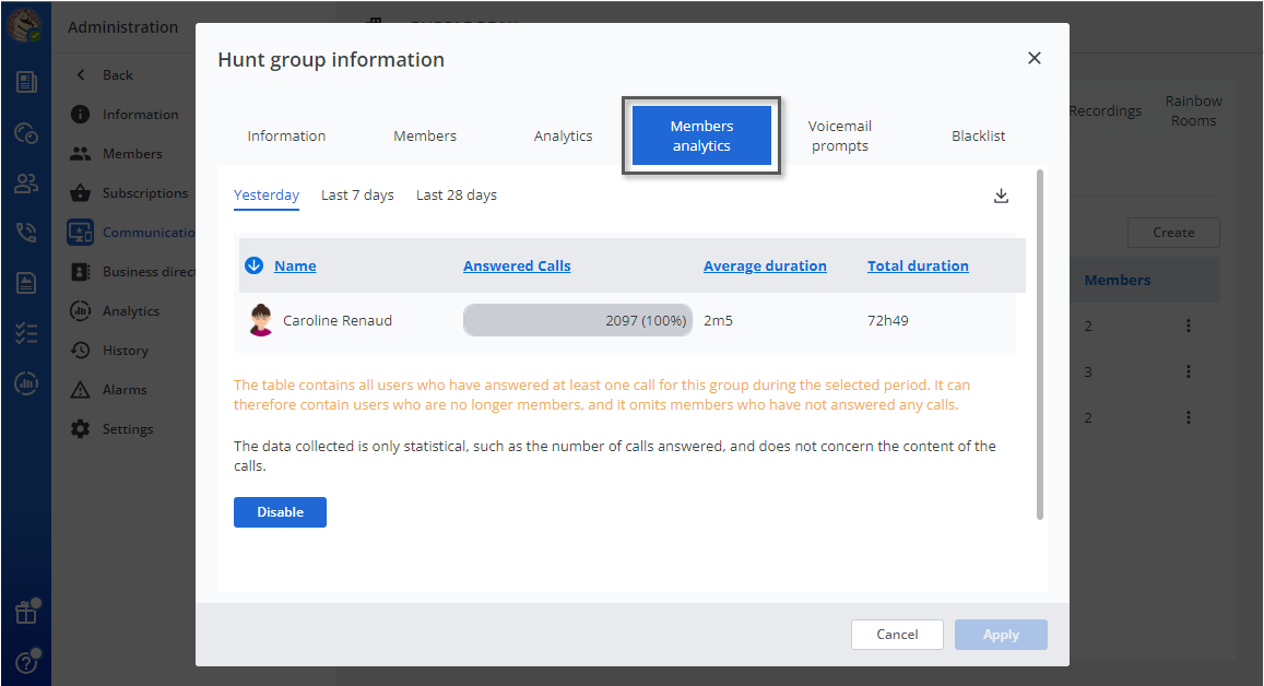In de tabel ziet u voor elke gebruiker die ten minste één oproep heeft beantwoord, het aantal beantwoorde oproepen, de gemiddelde duur van de oproepen (in minuten) en de totale duur van de oproepen (in uren). Klik op een kolom om de rijen te sorteren. De tabel bevat alle gebruikers die tijdens de geselecteerde periode ten minste één oproep voor deze groep hebben beantwoord. De tabel kan dus gebruikers bevatten die geen lid meer zijn, en geen leden die geen oproepen hebben beantwoord.