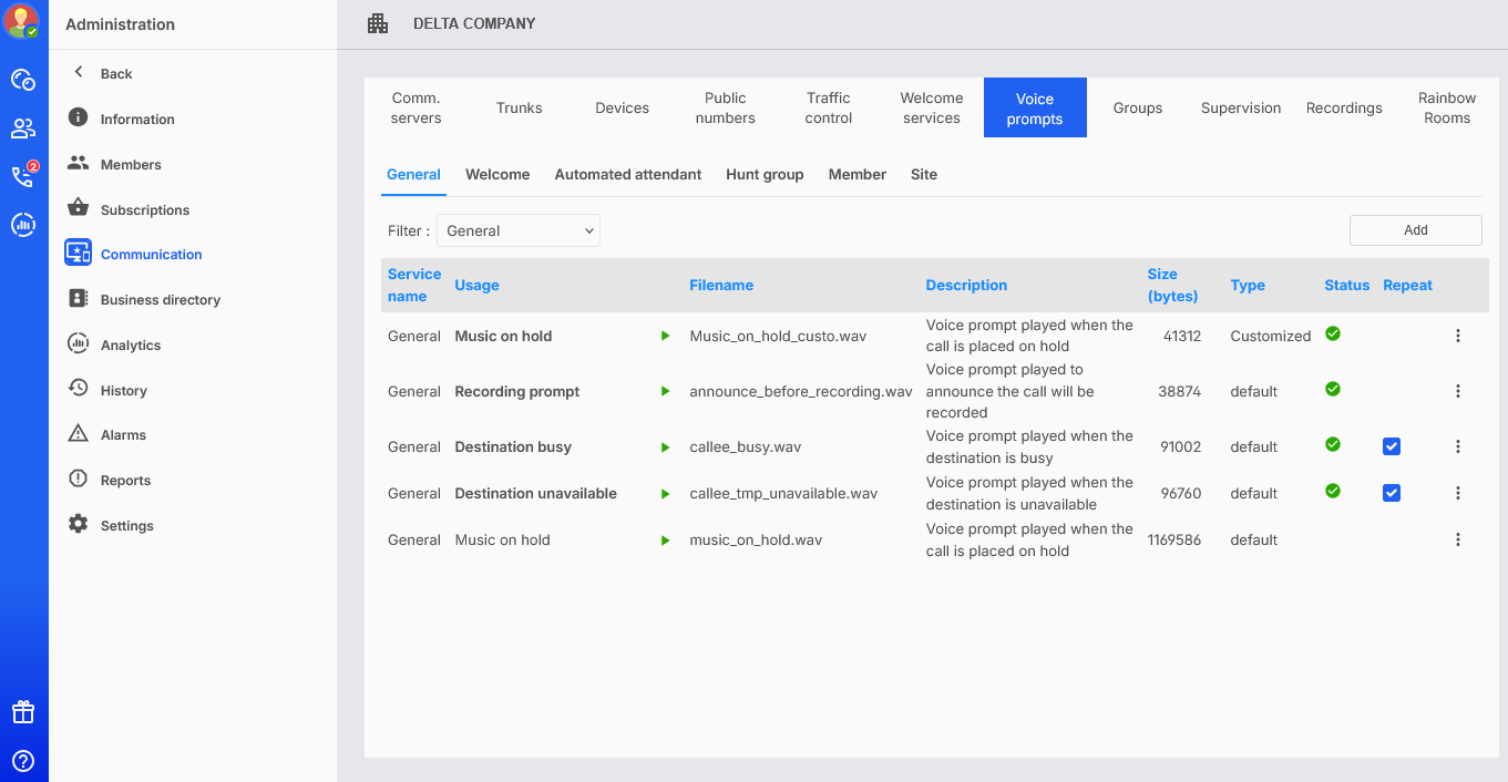 De aangepaste stemmeldingen kunnen gedeactiveerd, geactiveerd, verwijderd (indien inactief), herhaald worden voor bellers (voor geautoriseerde stemmeldingen) en lokaal gedownload worden: zie: Stemprompts beheren.