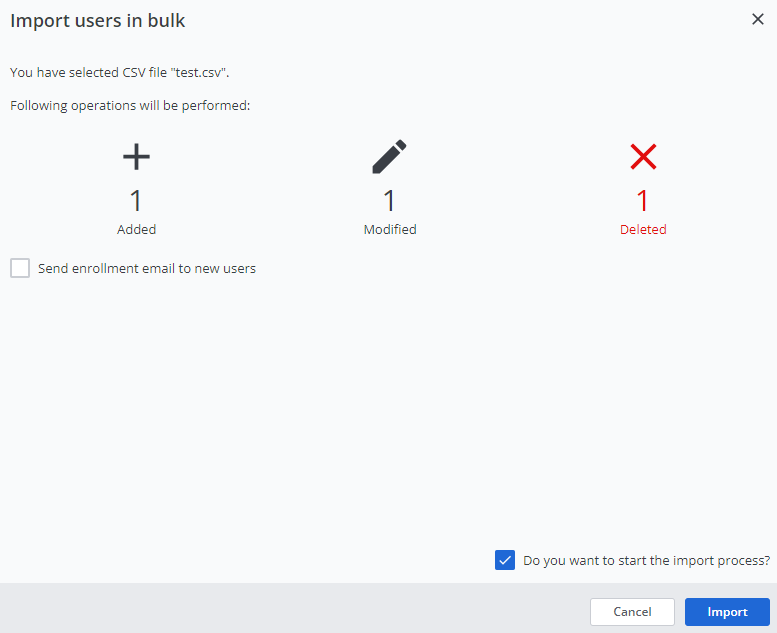 Er wordt een samenvatting weergegeven van de bewerkingen die in het bestand zijn uitgevoerd. - Selecteer, indien nodig, Send enrollment email to new users.
