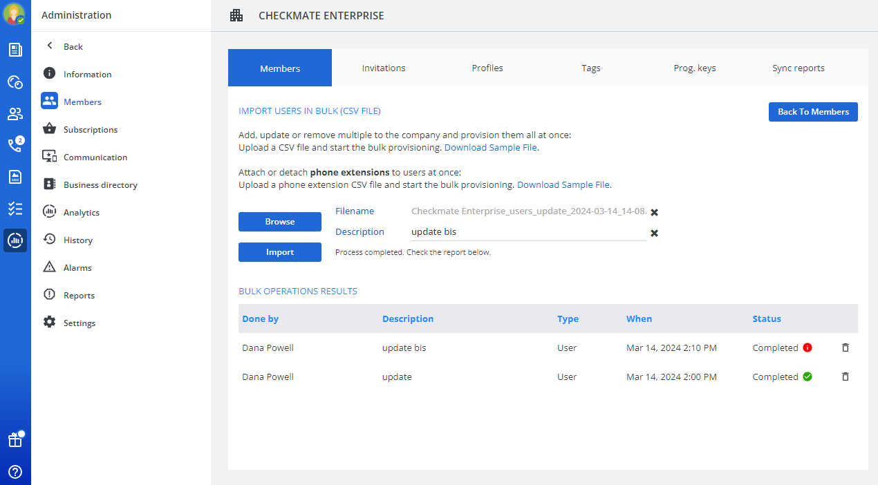 - Om nieuwe bedrijfsleden aan te maken en/of PBX-gegevens te koppelen, klikt u op Importeren, CSV-pictogram en Voorbeeldbestand downloaden.