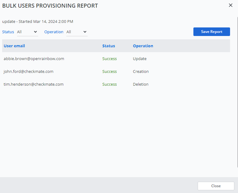 De rapporten voor bulk provisioning staan in de tabel Bulk Operations Results. Deze tabel bevat ook de ledenvoorziening via de Active Directory van het bedrijf, indien geconfigureerd: de kolom Gereed door geeft ldap-connector weer in plaats van administratornaam. - Klik op het doelrapport om de lijst met uitgevoerde operaties en hun status weer te geven.