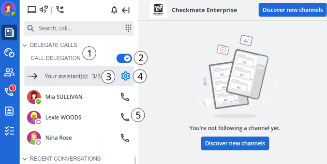 - Alle assistenten staan vermeld in de sectie"Oproepen delegeren" boven de"Recente gesprekken".