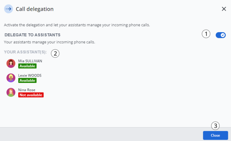 - Delegatie activeren: de manager ontvangt geen oproepen meer. De oproepen van de manager worden beheerd door beschikbare assistenten in de groep. Delegatie kan geactiveerd worden door de manager op voorwaarde dat er minstens één assistent in de groep is.