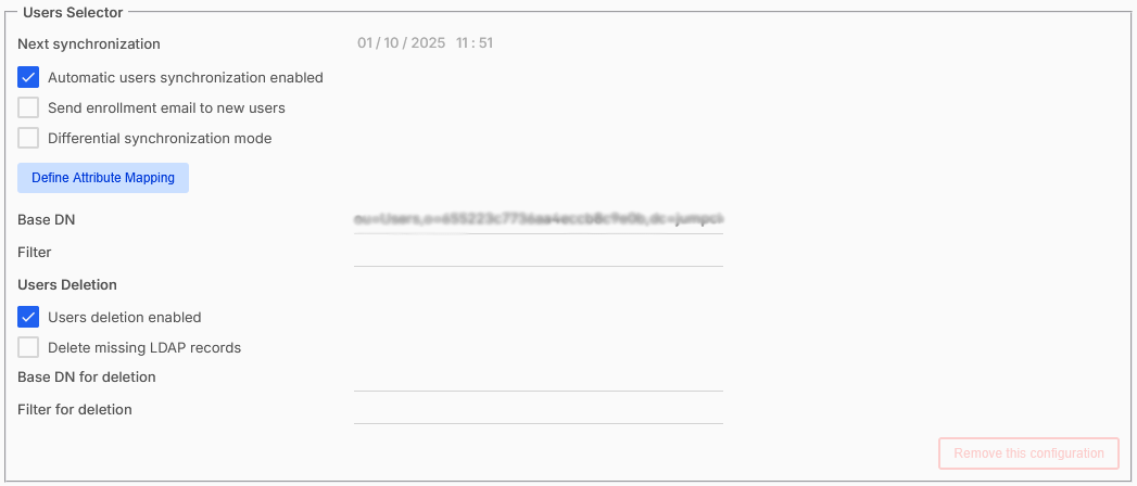 - Selecteer Gebruikers verwijderen ingeschakeld om de gebruikers die in de LDAP-directory zijn verwijderd ook in Rainbow te verwijderen.