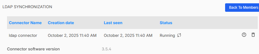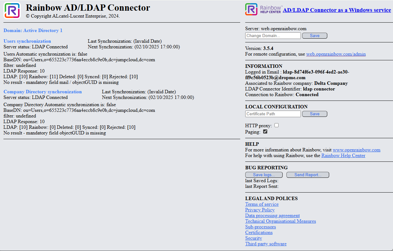 Informatie over Rainbow LDAP Connector wordt bovenaan het venster weergegeven, inclusief de aanmaakdatum, softwareversie en LDAP-directorysynchronisatiestatus. De status is Lopend als Rainbow LDAP Connector met het bedrijf in Rainbow verbonden is.