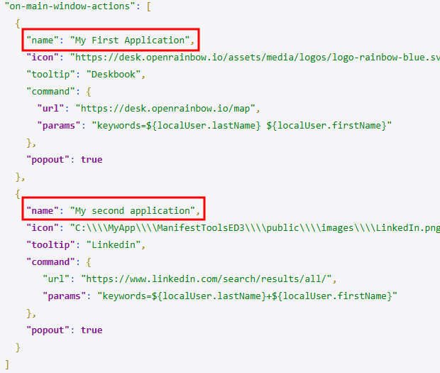 - on-main-window-actions: om een toepassing van derden weer te geven in de Rainbow toepassing (alleen metpopout optie ingesteld op waar: zie: Extra velden)