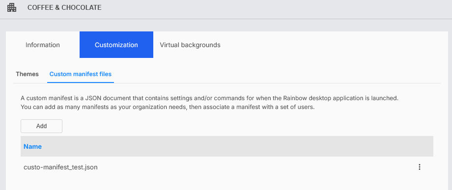 Wanneer u vanuit de beheerapplicatie van Rainbow implementeert, kan het bestand custo-manifest.json niet langer lokaal geconfigureerd worden vanuit de Rainbow applicatie van bedrijfsleden: export/import opties worden niet langer aangeboden.