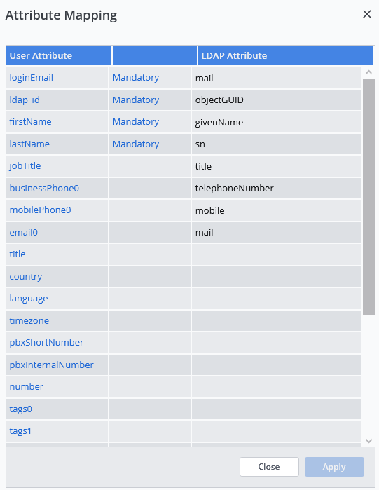 Attribuuttoewijzing definieert de overeenkomst tussen de attributen van LDAP-directory en de attributen van Rainbow. Er moeten twee verschillende mapping tabellen geconfigureerd worden voor gebruikers en contacten.