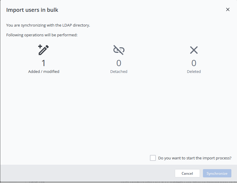 Als het resultaat correct is, kunt u een handmatige synchronisatie starten: selecteer Do you want to start the import process, klik op Synchronize en bevestig door nogmaals op Synchronize te klikken.